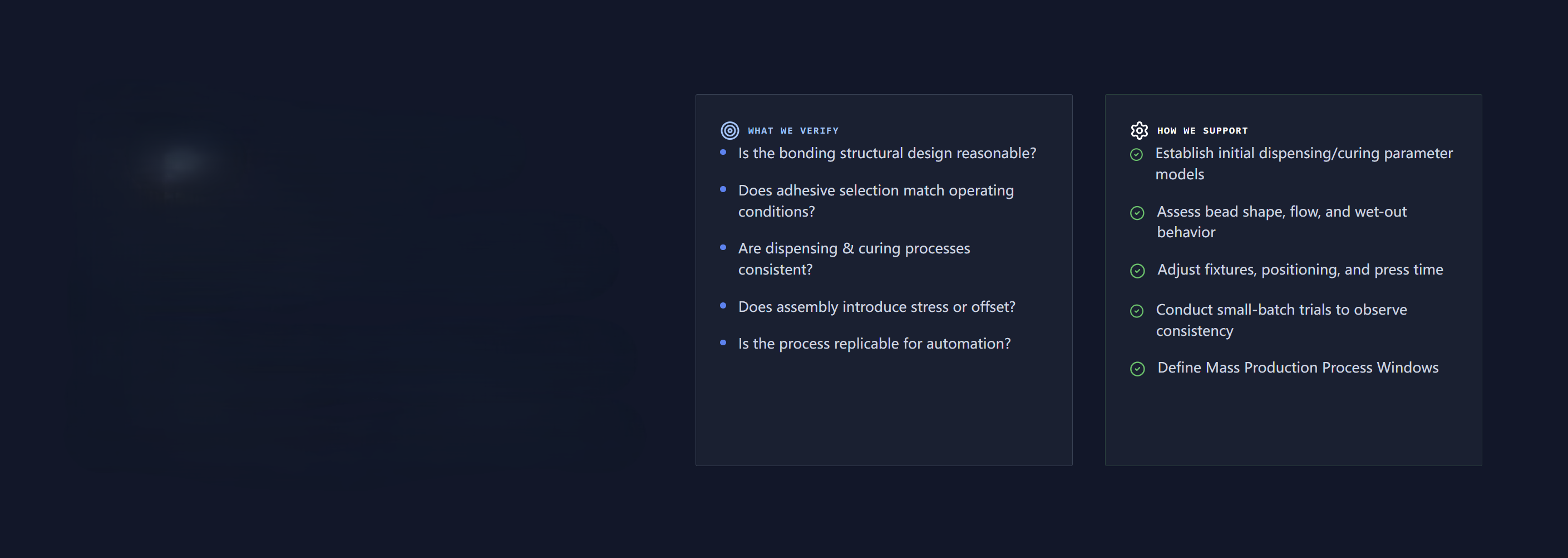 We validate flow behavior, cure uniformity, and automation feasibility.